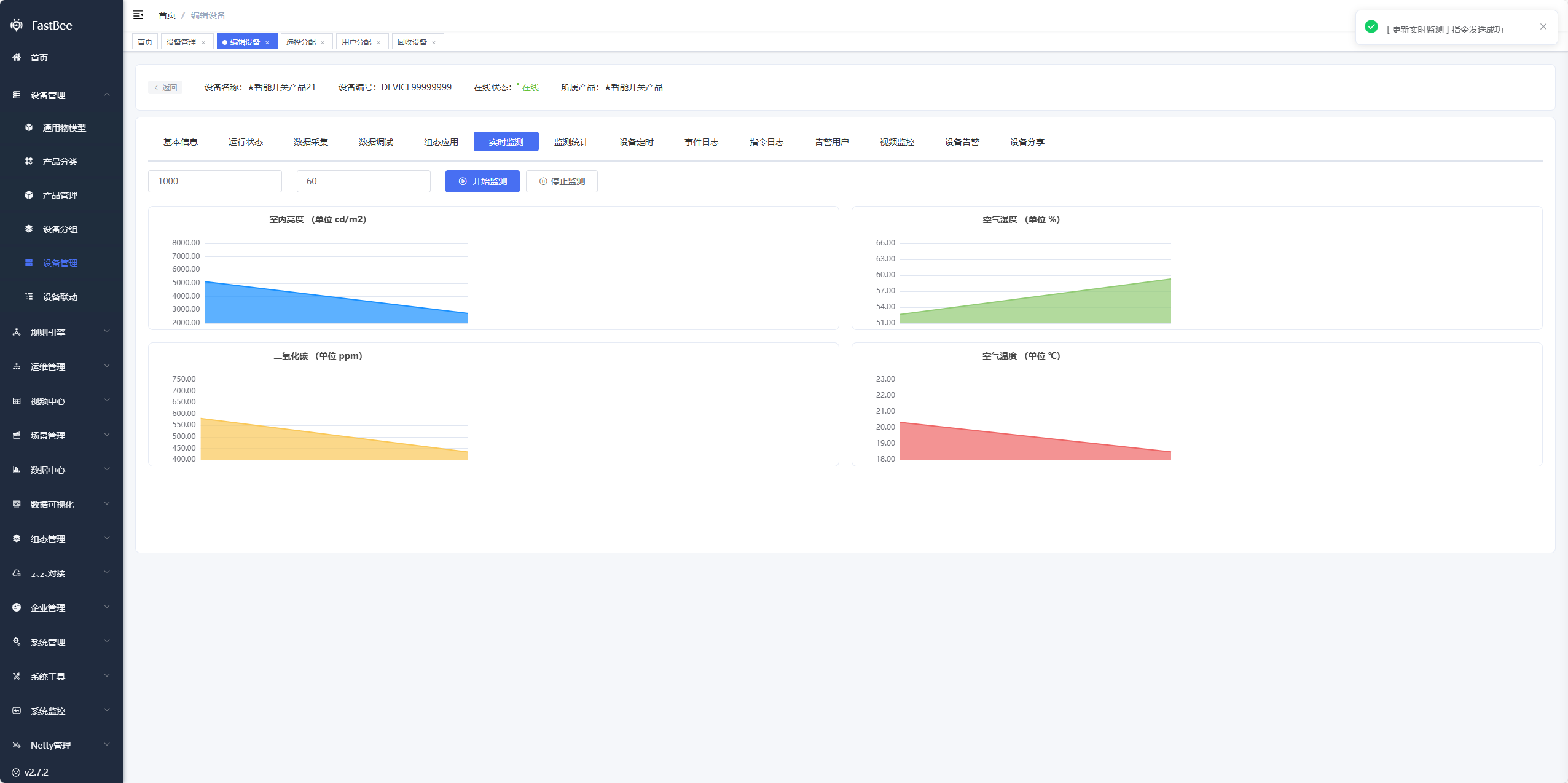 展示设备物模型的运行状态,可直接在页面上控制下发指令