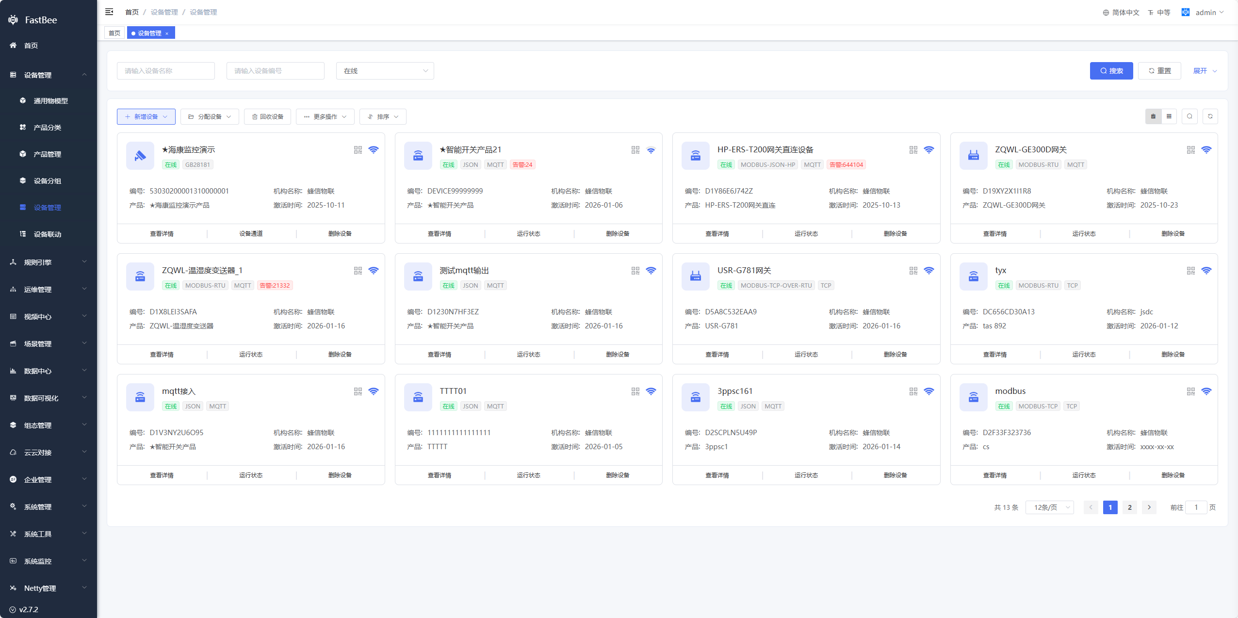 设备是产品的具体实现,云平台每个设备实体它代表的是您在真实场景下使用的设备,通过云平台可以实时查看设备的状态信息,这个设备可以是网关、温湿度传感器、仪器仪表等。