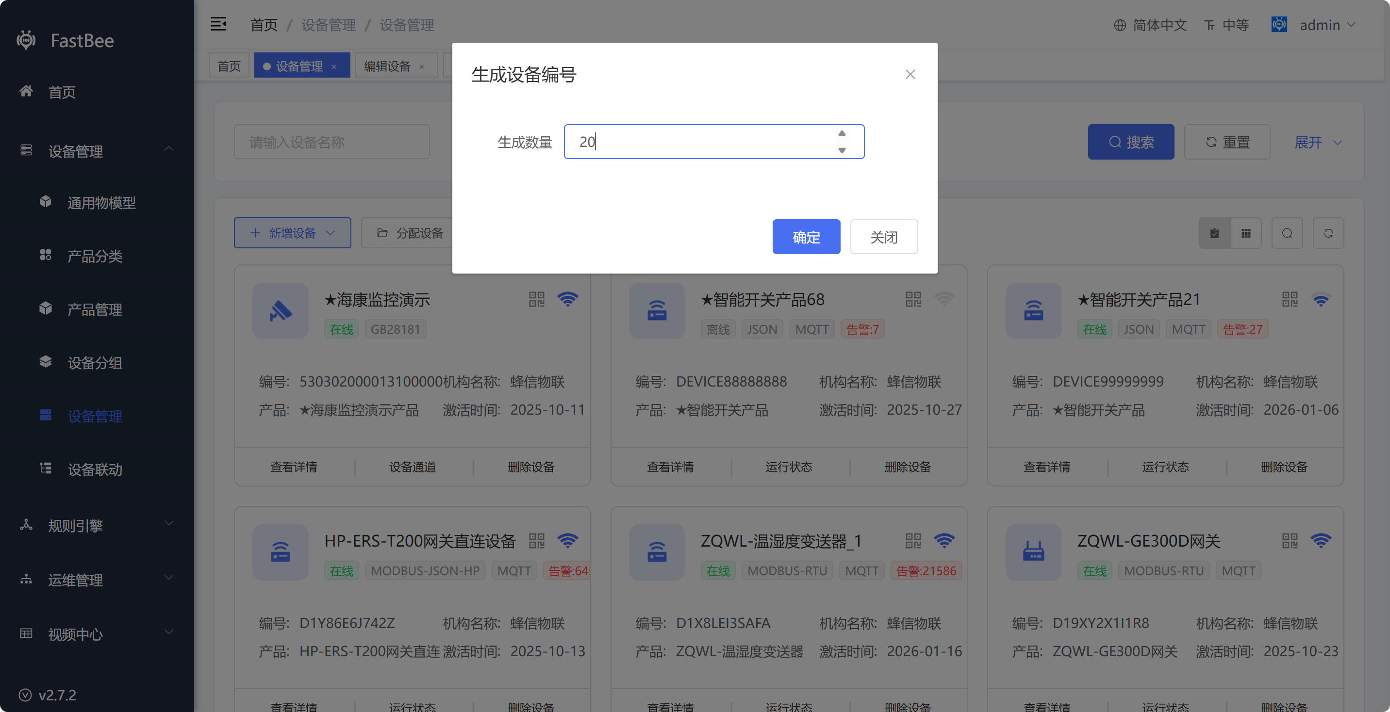 - 生成设备编号:填入生成数量,点击确定,下载设备编号生成模板