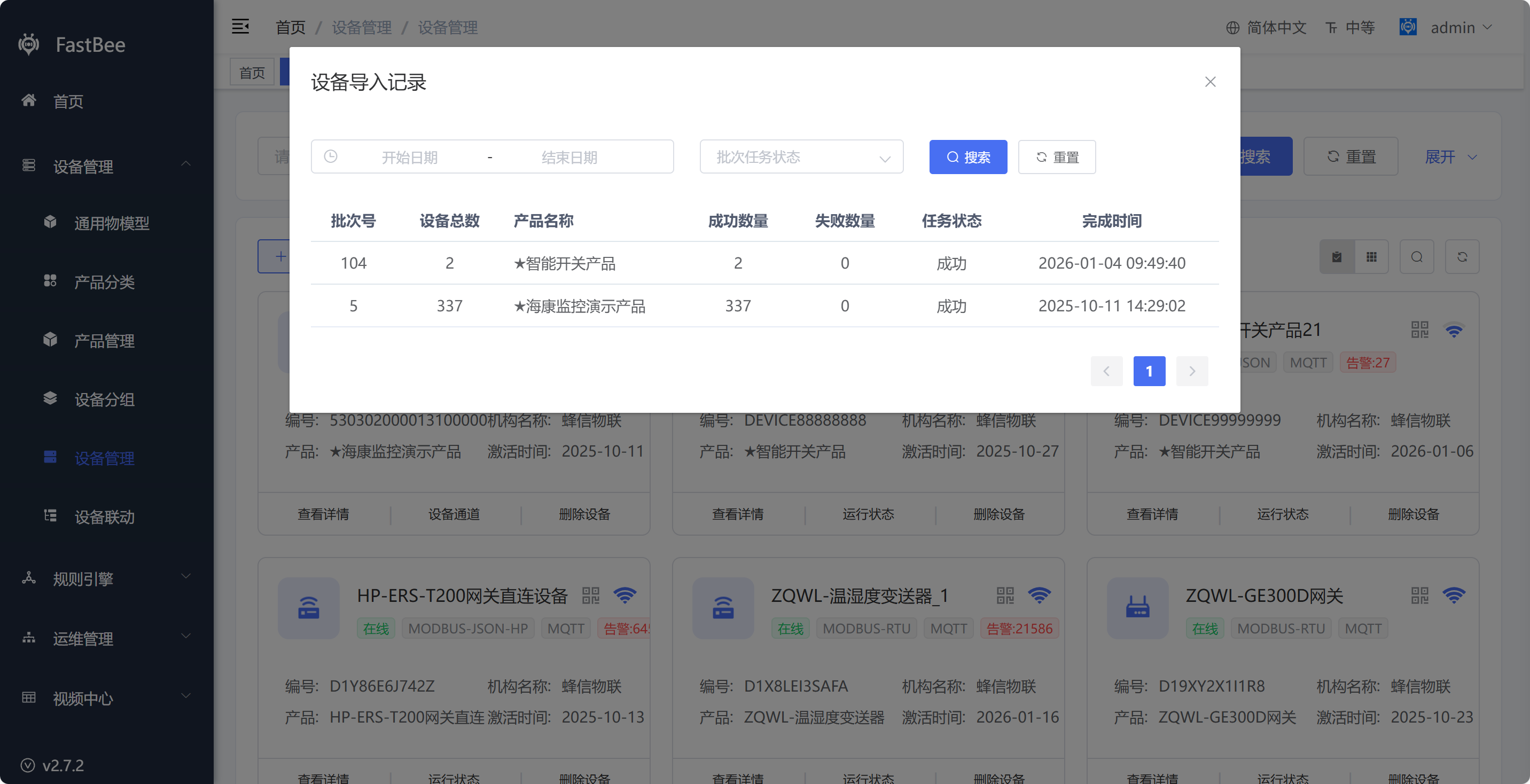- 导入记录:可以看到不同产品导入设备数量的记录