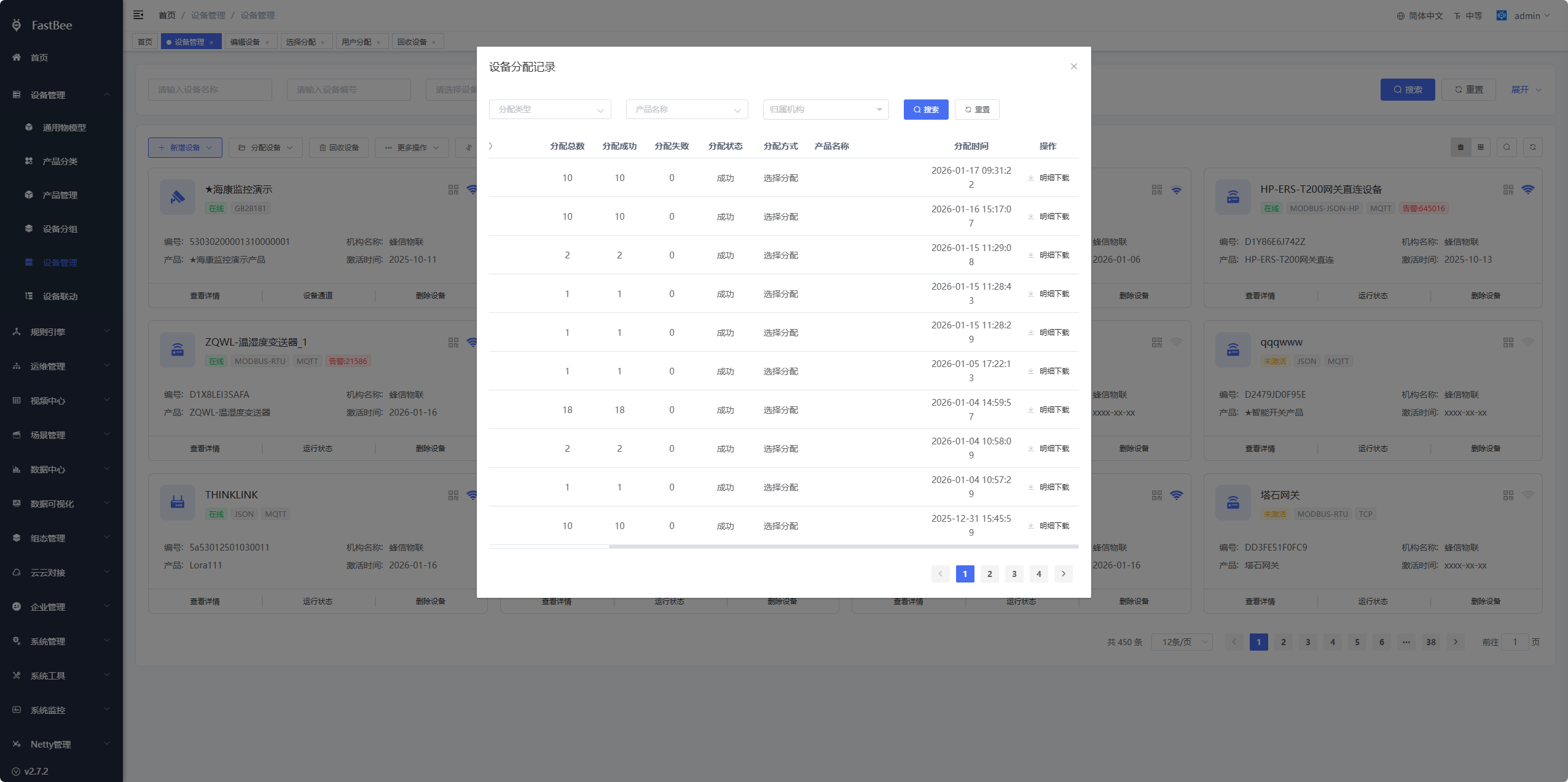 - 设备分配记录:可以看到设备分配记录,还可以下载明细,查看产品下具体分配的设备