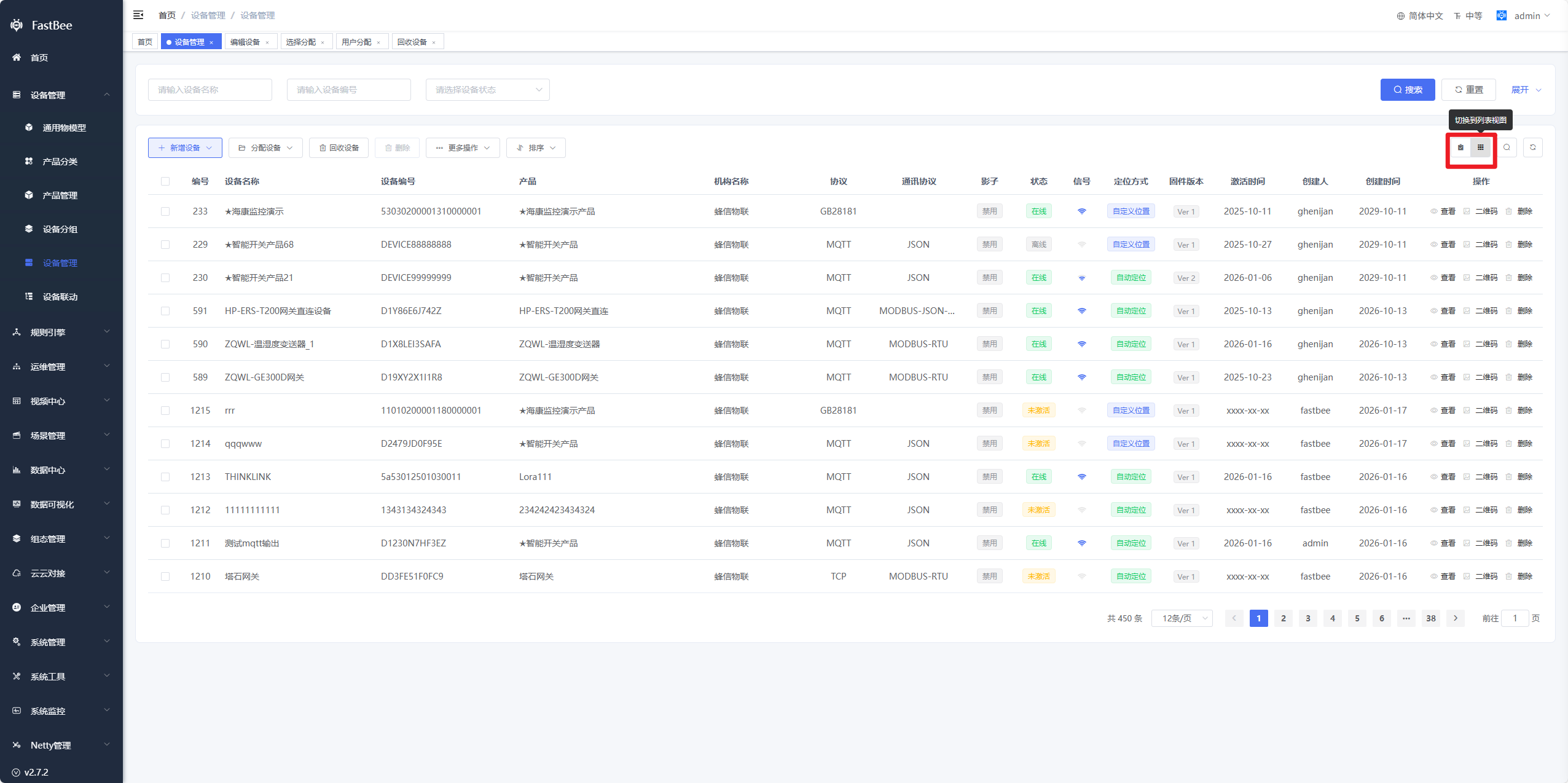 - 用户分配:同机构内不同用户之间分配设备,一般就是指定某个用户只能查看部分设备时使用,但用户角色数据权限必须是仅本人数据权限