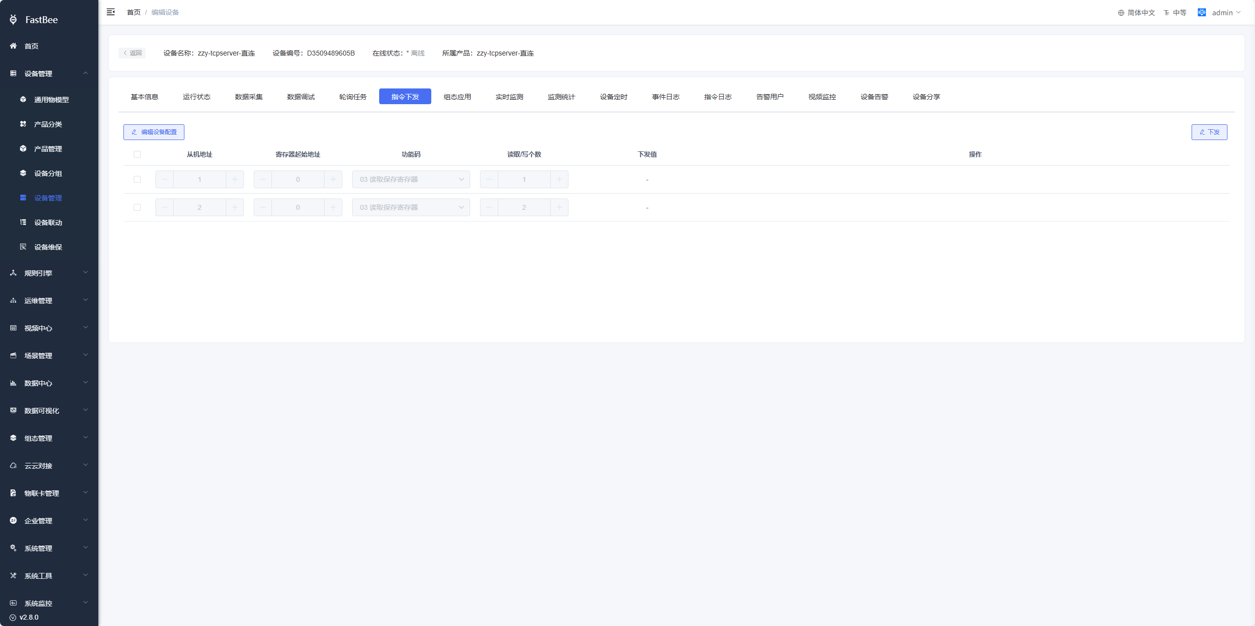 产品通讯协议为ModbusTcp协议的才有此功能,可在此配置指令,点击下发按钮即可