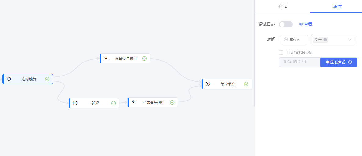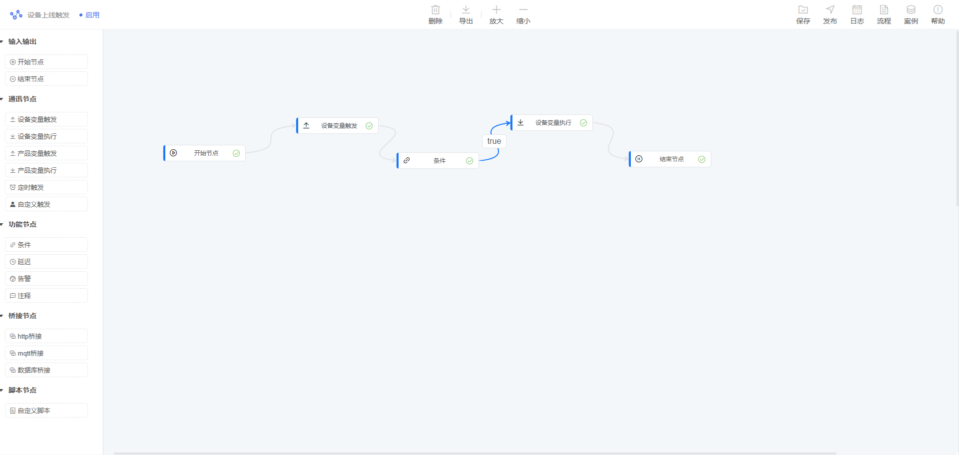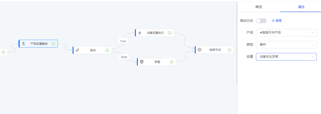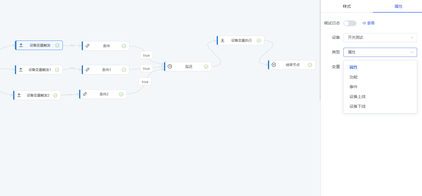 - 用于设置触发条件的设备物模型变量,配合条件组件使用。定义某个设备触发的某个属性,某个事件,某个功能,设备上下线等触发