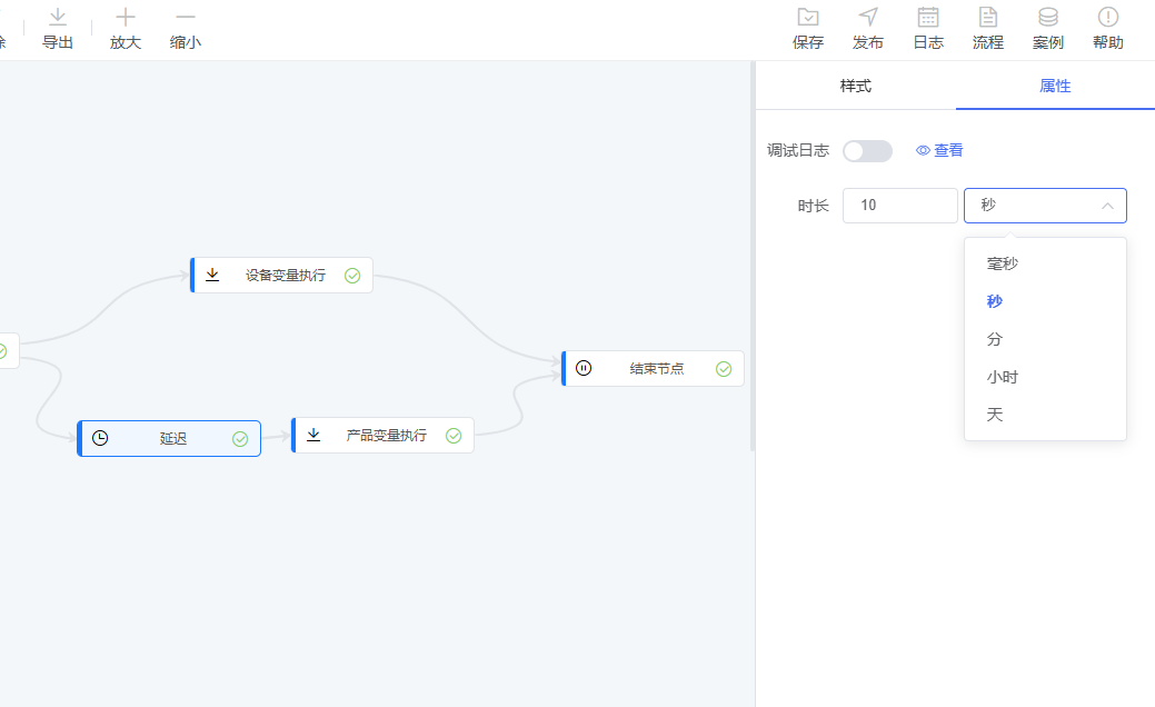 常见的执行操作,例如删除、导出、放大、缩小、保存、发布、流程、案例和帮助等。