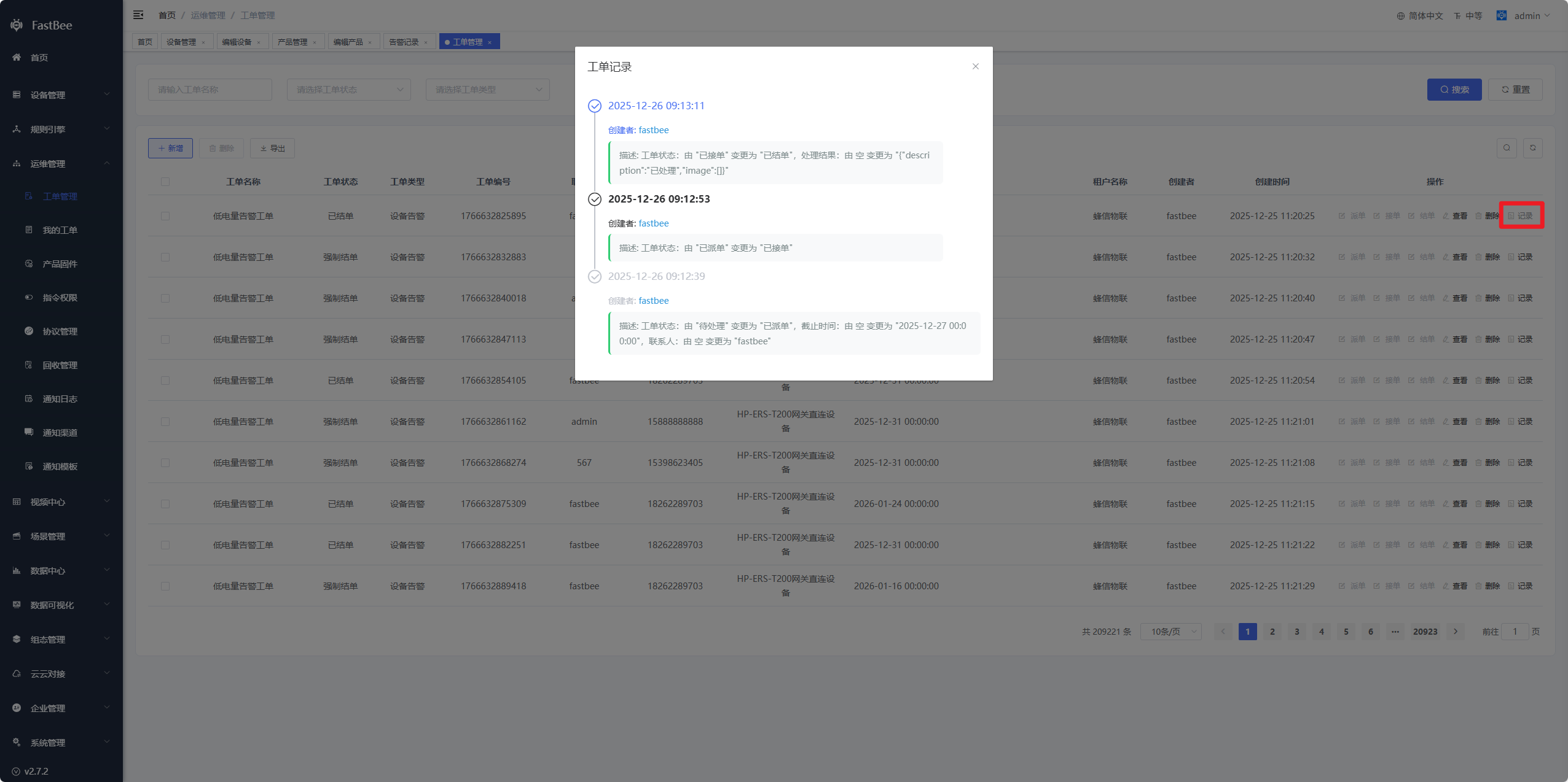 每次对工单的变更都会做一个记录,可点击记录按钮查询详细。